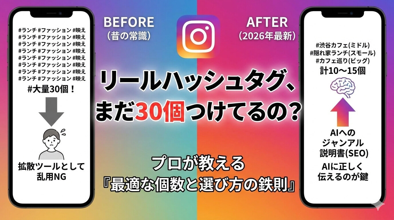 この記事では、プロのWebマーケターが「2026年版リールハッシュタグの正解」と、「最適な個数・選び方の鉄則」を解説します。間違った使い方をすると、逆に再生数が落ちる原因になるため要注意です。